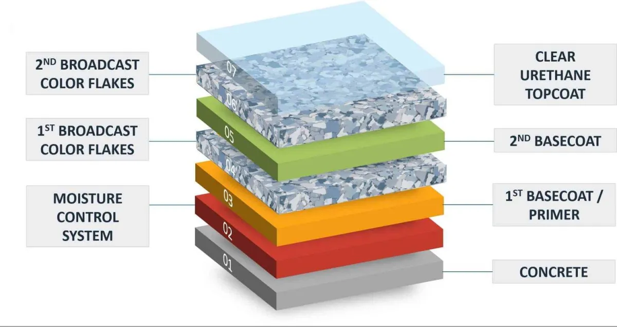We first evaluate the concrete to check for moisture content inside the slab. The we prepare the surface by completely grinding off the cap or first layer of the slab. The cap prevents epoxy's or paints from bonding to the concrete. Once the cap is removed and the pores of the concrete are opened, we apply a thick coat of epoxy and flake to the slab. After the epoxy has sufficiently cured we apply a top coat to protect and seal the coating.